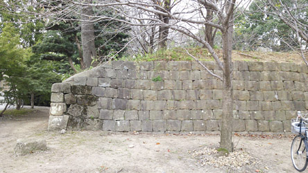 柳城中校門前の、柳川城趾の石垣。(地図4)