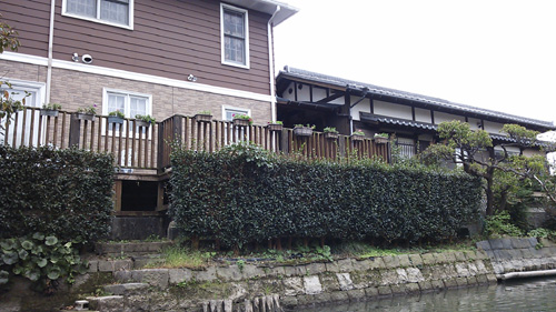 川下りから下船して、沖の端。じぃじと歩いてたそらちゃんの背景にあった酒屋。(地図2)